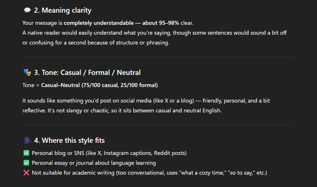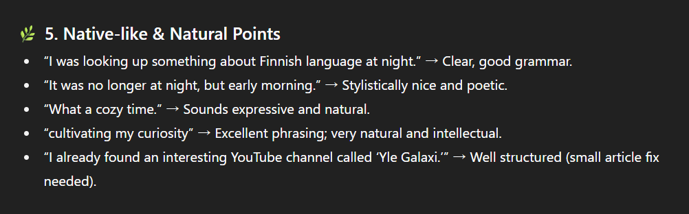 It’s good enough to step it up a notch and work on pronunciation after I’ve made it a habit to watch Finnish videos. Of course, English is still the language I spend the most time on for now.