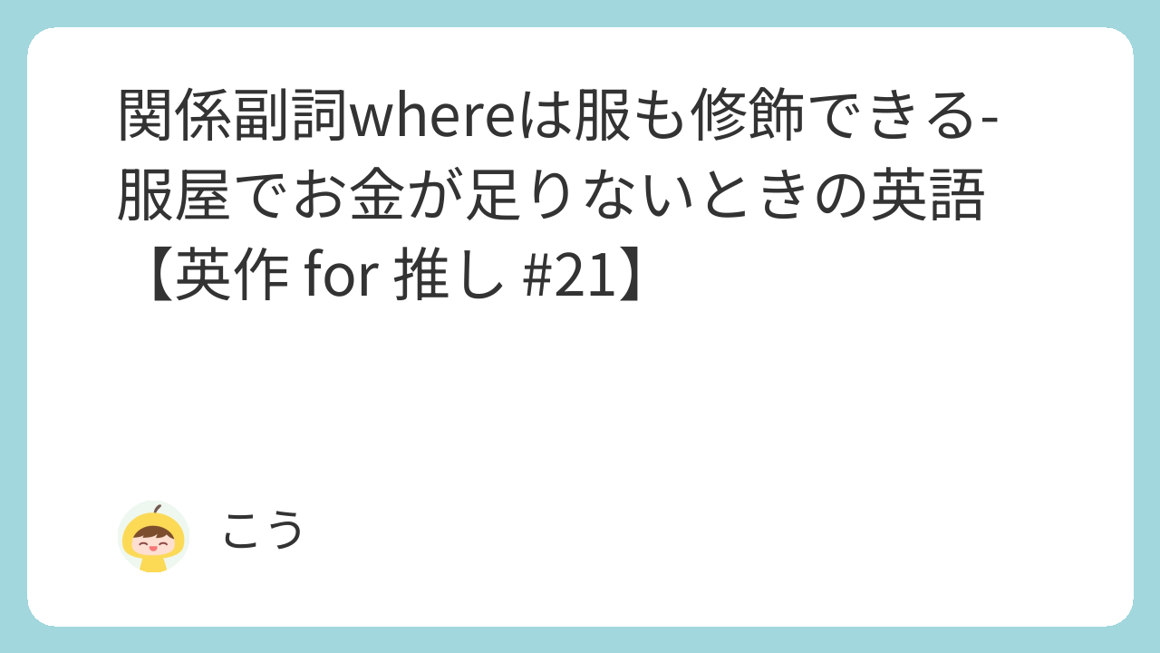 関係副詞のwhereは場所だけじゃなくてsituationやcaseなんかの状況など場所という概念から拡大した名詞も修飾できるっていうことは有名かもしれないけど、会話の中ではさらに拡張性が高まって今回みたいに服を修飾するケースもある。もしかしたら、服だけじゃなくてもっと意外な名詞も修飾できるかもしれない。
